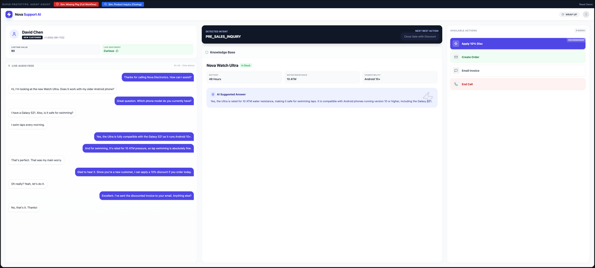 To demonstrate this, I used a concept called "Nova Support AI." The goal was to build a real-time agent assist platform that analyzes voice intent and sentiment to surface the "Next Best Action" for support staff.